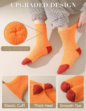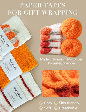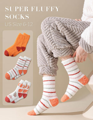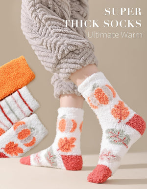 Festive Fall Designs: These novelty fuzzy socks feature iconic autumn motifs, including pumpkins, maple leaves, vibrant orange accents, and stylish stripes. Perfect for adding a cozy, seasonal touch to your wardrobe.
