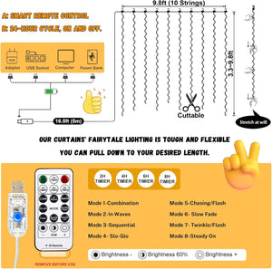 Our curtain lights feature a generous 16.5 ft lead wire, with 300 individual LEDs across a 9.8 ft x 9.8 ft curtain. The included extra long power cord allows for flexible placement. The tough, flexible copper wire drop strings let you easily adjust the height and shape to create your dream design. (Curtain not included.)