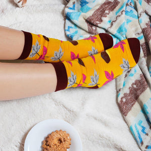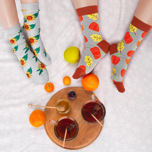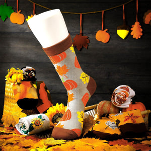Full of Fall Festivity: These Thanksgiving socks feature warm autumn colors like white, brown, and orange, along with adorable patterns such as turkey, maple leaves, pumpkins, candy, chestnuts, cake, ice cream, and coffee. They perfectly capture the spirit of Thanksgiving, adding a festive touch to your wardrobe.