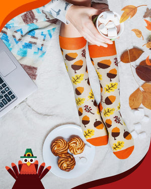 Charming Holiday Designs: Featuring classic Thanksgiving motifs like pumpkins, autumn leaves, corns, and acorns, these socks are both cute and stylish. They add a delightful touch to your festive wardrobe, helping to liven up the holiday atmosphere.