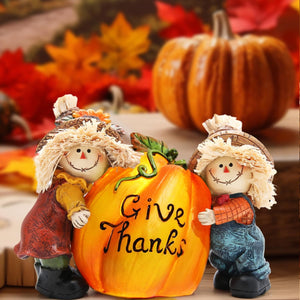 Thanksgiving Embrace: This delightful resin sculpture features two charming straw figures embracing a large pumpkin, a beautiful representation of gratitude and unity. It’s an ideal way to add a meaningful, festive touch to your Thanksgiving decor.